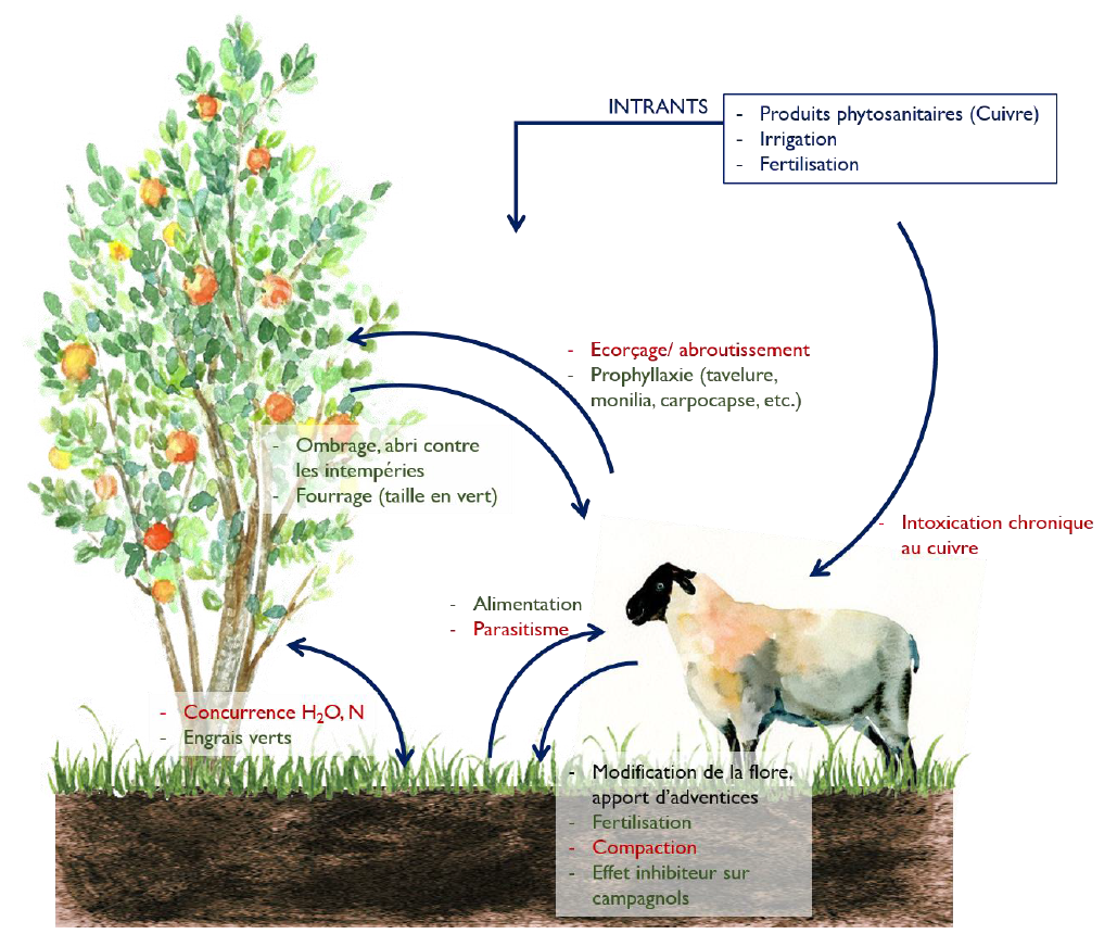 L’industrialisation de l’agriculture dans la 2e moitié du XX e siècle a mené à la spécialisation des productions, et en particulier à la disparition progressive de formes anciennes d’intégration des animaux dans les cultures. Cette pratique connaît un renouveau depuis une décennie environ, du fait de son potentiel de synergie entre différents éléments des exploitations agricoles, menant ainsi vers une agriculture « écologiquement intensive », dans l’esprit de l’agro-écologie. Les potentiels avantages du pâturage ovin en vergers sont très vastes (Figure 1), à commencer par la réduction voire l’abandon du recours à des substances herbicides ou aux fauchages mécaniques, et parallèlement l’accès des animaux à des ressources fourragères pour l’instant inexploitées. Par diminution de l’inoculum de certains bio-agresseurs (tavelure, carpocapse, campagnols, etc.), cette pratique pourrait mener à une réduction drastique de l’emploi de produits phytosanitaires.